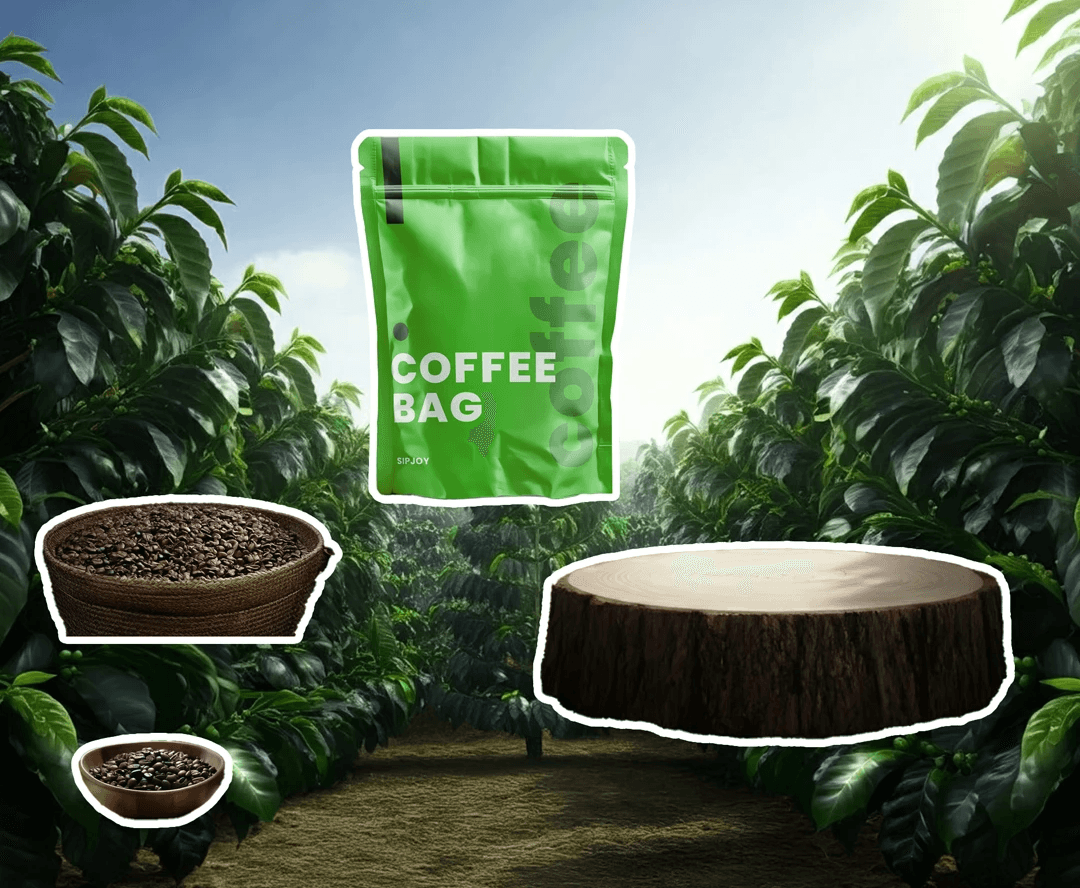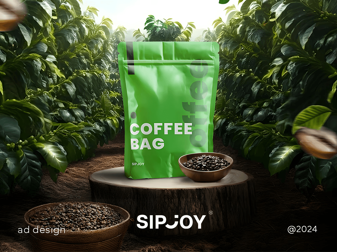 Imagine a journey that begins amidst lush green coffee trees, where each bean is nurtured by nature's embrace. sipjoy captures this essence in a captivating visual story for SipJoy. This isn't just a coffee bag; it's a portal to pure joy. The design transports you to the heart of the coffee plantation, where the aroma of freshly roasted beans fills the air. SipJoy's commitment to quality shines through in every pixel, promising an unparalleled coffee experience